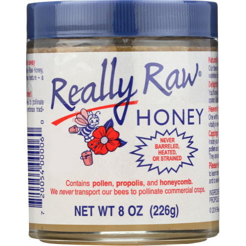 Really Raw Honey is a totally unprocessed whole food, that is never heated or strained, and contains all the pollen, propolis, vitamins, enzymes and trace minerals the bee's put into it. Creamy, smooth and spreadable, Really Raw Honey is more solid than liquid and each jar is capped with crunchy bits of honeycomb, pollen and propolis.