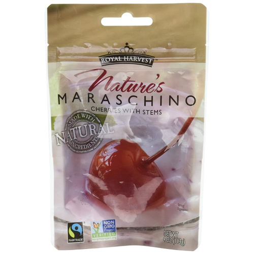 Our Nature's Maraschinos have more of the traditional full bodied wild cherry flavor. You'll love the lingering sweetness and the hints of vanilla and almond. Royal Harvest Natures Maraschinos are the perfect garnish or topping for any dessert or beverage.