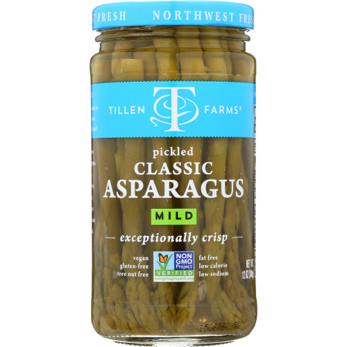 One of our two original products that we introduced in 1984, this has been a bestseller from the beginning. Tillen Farms Asparagus are grown and harvested during a short 6-8 week period in late spring. Because of our fanatical commitment to quality, the local farmers offer us their best products. Within hours of picking, these beauties have been sorted, cleaned, trimmed, blanched and then carefully hand packed in a mild pickle brine with a garlic clove to round out the flavor. The crispness is unique and the taste is exceptional. It's no surprise that Asparagus is our joint # 1 selling variety (tied for #1 with our Hot and Spicy Beans.) For best results, refrigerate before serving.