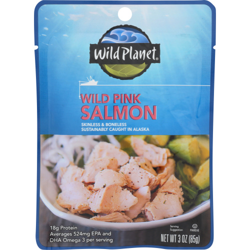 18g Protein, 50% Daily Value of Vitamin D, and an average of 524mg EPA and DHA Omega 3 per 3oz serving.The convenient pouch is perfect for travel, school or office!Wild Pink Salmon is sustainably caught in the cold, clear Alaskan waters by small-scale fishing families. Skinless and boneless, this delectable salmon is cooked right in the pouch to retain nutritional potency and the flavorful natural juices.