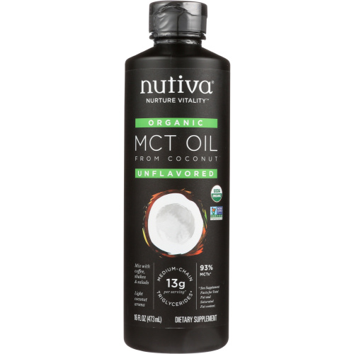 Nutiva Organic MCT Oil is an oil concentrated with the Medium-chain triglyerides, capric acid and caprylic acid. Medium-chain triglycerides, or MCTs, are the types of saturated fatty acids typically found in coconuts. Using a USDA certified organic process, we gently remove the fats from virgin coconut oil that remain solid at room temperature, leaving high levels of capric and caprylic acids. Unlike non-organic MCT Oil brands, there are no chemicals or filler oils used during this process, resulting in a clean, light coconut-flavored MCT Oil with no harsh aftertaste.