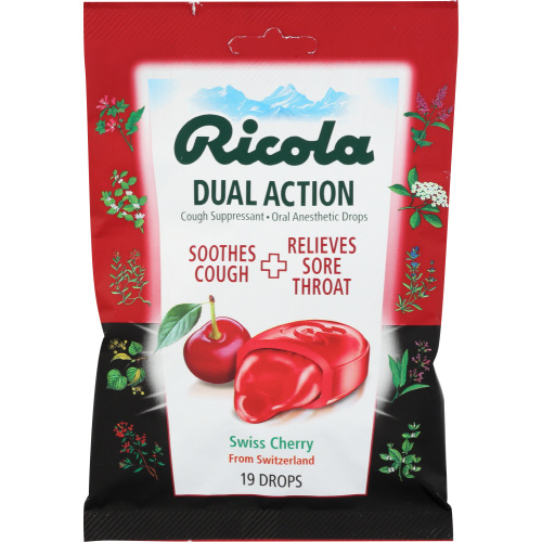 Ricola Dual Action drops provide naturally effective relief for both your cough and sore throat. Our unique blend of ten natural Swiss alpine herbs, natural menthol and soothing syrup center, combine to give you fast, safe relief you can trust.